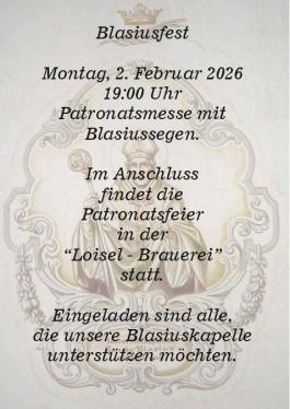 Die Patronatsmesse St. Blasius findet am Montag, den 02.02.2026 um 19:00 Uhr in der Kapelle in Sellinghausen statt. Anschließend ist in der Loiselsbrauerei die Patronatsfeier