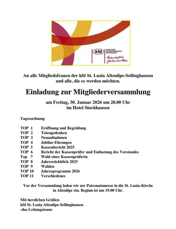 Am 30.01.2026 findet um 19:00 Uhr die Patronatsmesse der kfd Altenilpe - Sellinghausen in der St. Luzia Kirche in Altenilpe statt. Anschließend ist um 20:00 Uhr im Hotel Stockhausen die Generalversammlung.
